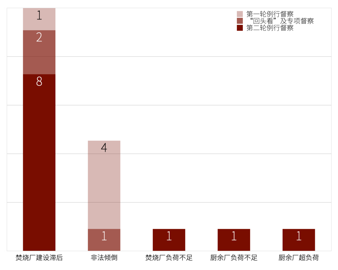 還有一些生活垃圾問題在新的垃圾管理模式下爆發(fā)。其中,焚燒廠建設(shè)滯后問題在第一次例行督察、“回頭看”及專項(xiàng)督察和第二次例行督察分別出現(xiàn)1次、2次、8次,愈演愈烈;還有一些生活垃圾問題在2020年5月至2022年6月期間的第二輪例行督察中首次出現(xiàn),比如焚燒廠負(fù)荷不足、廚余廠負(fù)荷不足、廚余廠超負(fù)荷。