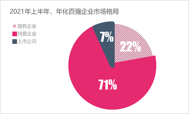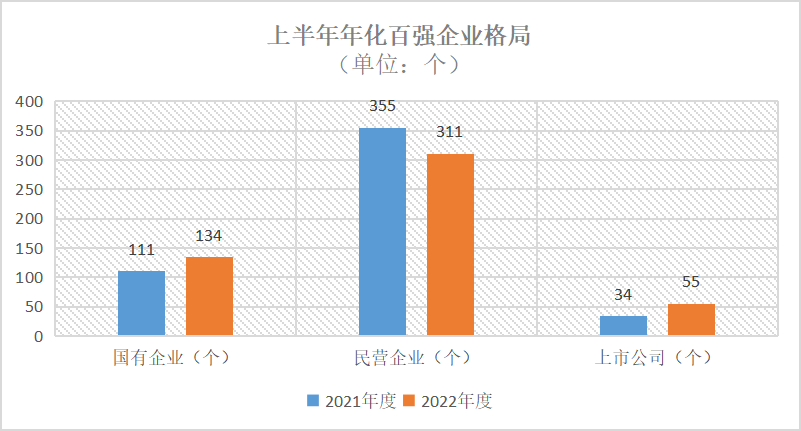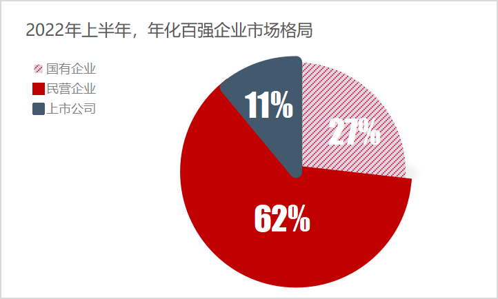 2022年1-5月份,年化額百?gòu)?qiáng)企業(yè)中(5個(gè)月度的年化百?gòu)?qiáng)企業(yè),總數(shù)為500家),國(guó)有企業(yè)134家,占比27%;民營(yíng)企業(yè)311家,占比62%;上市公司55家,占比11%。