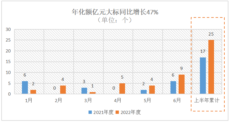 截止6月25日,2022年上半年累計(jì)開(kāi)標(biāo)年化額超億元環(huán)衛(wèi)大標(biāo)總數(shù)達(dá)25個(gè),同比增長(zhǎng)47%。去年同期開(kāi)標(biāo)年化額超億元環(huán)衛(wèi)大標(biāo)總數(shù)為17個(gè)。