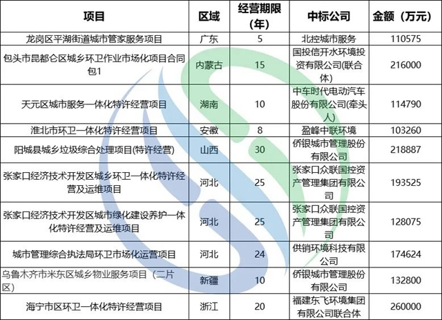 東飛環(huán)境、北控城市服務(wù)等傳統(tǒng)環(huán)衛(wèi)企業(yè),上半年同樣表現(xiàn)不俗。東飛環(huán)境中標3個億級項目,合同額31.25億,同時,東飛環(huán)境以聯(lián)合體成員身份攜手浙江海云環(huán)保中標了上半年合同金額最高的環(huán)衛(wèi)項目,海寧市區(qū)環(huán)衛(wèi)一體化特許經(jīng)營項目,中標價:116432911元/年,另算使用者付費:其他垃圾收集和轉(zhuǎn)運12256867元/年+糞便清運及處理有償收費773500元/年,特許經(jīng)營期年限20年,合計總金額達26億元;北控城市服務(wù)中標4個億級項目,合同總額23.96億,包括深圳兩個街道的大管家項目,合同總額近20億。