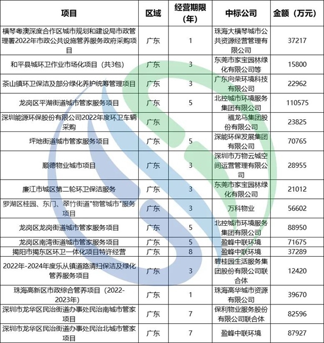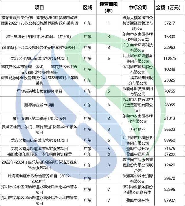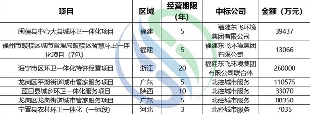 東飛環(huán)境和北控城市服務(wù)上半年億級項目中標情況
