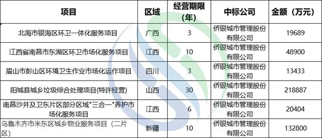 上半年,僑銀股份以6個項目,45.41億的合同排名第二!項目區(qū)域分布較為分散。目前,僑銀股份的城市大管家服務(wù)布局全國百城,標桿項目包括合同額67億元的昆明官渡一體化PPP項目、廣州市本級環(huán)衛(wèi)一體化PPP項目等。