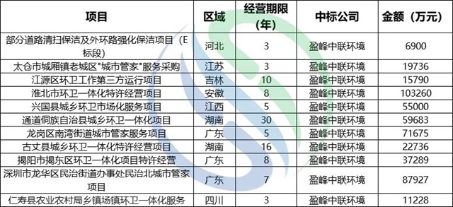 盈峰環(huán)境上半年億級項目中標情況