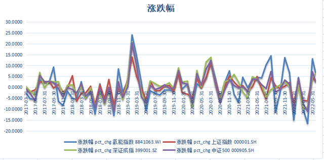 自2019年開(kāi)始?xì)淠苁状伪粚?xiě)入政策,2020年一系列政策出臺(tái)大力推行氫能發(fā)展到寫(xiě)入“十四五”規(guī)劃確定氫能源的戰(zhàn)略地位,氫能指數(shù)估值也隨著政策的一步步推動(dòng)穩(wěn)步上升,基本超越大盤(pán)指數(shù)(圖4),其中2021年氫能指數(shù)攀升40%,超上證指數(shù)8倍,超深證成指13倍,超中證500指數(shù)2.6倍。2022年3月底國(guó)家能源局發(fā)布《氫能產(chǎn)業(yè)發(fā)展中長(zhǎng)期規(guī)劃(2021-2035年)》氫能指數(shù)又開(kāi)始波動(dòng)上升,屢屢超過(guò)中證500、上證A股等指數(shù)。這說(shuō)明了市場(chǎng)對(duì)利好信息的反應(yīng),資本市場(chǎng)對(duì)利好政策的敏感。