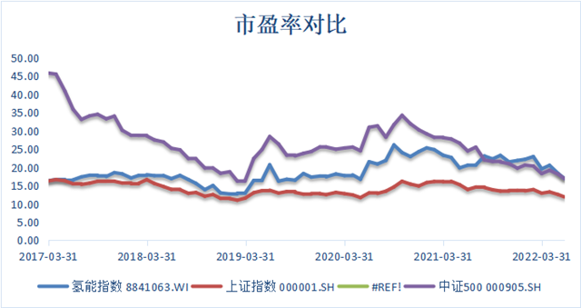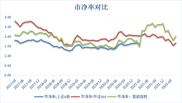 市凈率(圖5)是指每股股價(jià)與每股凈資產(chǎn)的比率,市凈率是評(píng)估一家上市公司的是否具備投資安全系數(shù)的核心財(cái)務(wù)指標(biāo),從2021年5月開(kāi)始,氫能指數(shù)的市凈率遠(yuǎn)超上證A股和中證500,說(shuō)明相對(duì)于其他指數(shù)氫能指數(shù)是更安全的投資。