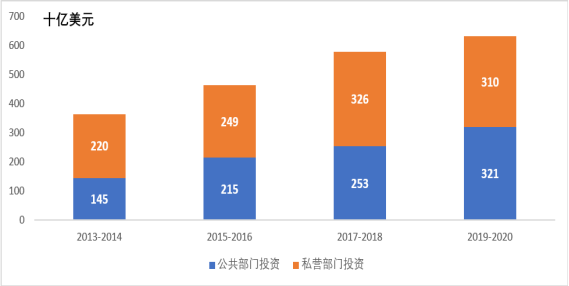 1.公共部門的氣候投融資資金主要來源于各類金融機(jī)構(gòu)、政府部門、氣候基金,其氣候投融資資金流量較2017/2018年增長了7%,基本穩(wěn)定在總額的51%(3210億美元)。