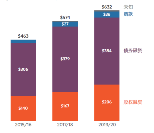 通常情況下,按照融資類型進(jìn)行劃分,氣候融資工具主要包括債務(wù)融資工具、股權(quán)融資工具以及贈(zèng)款,在2019/2020年度占?xì)夂蛉谫Y總量的比例分別為61%、33%及6%。