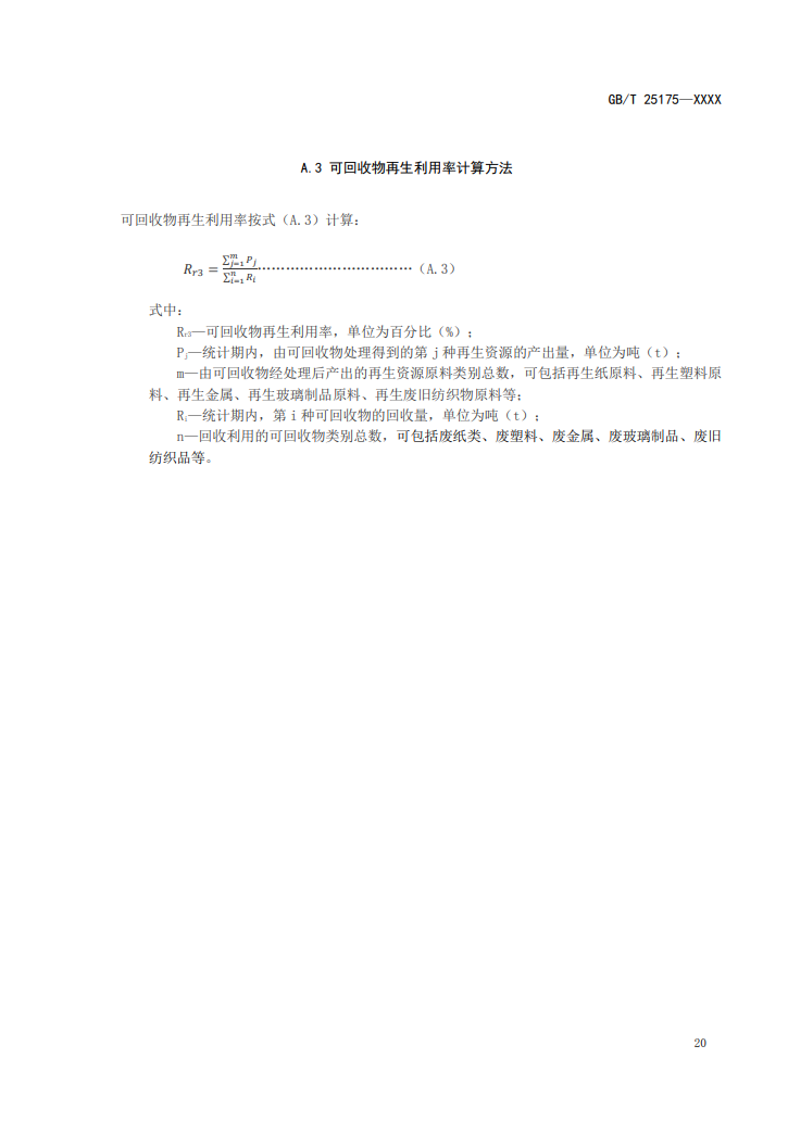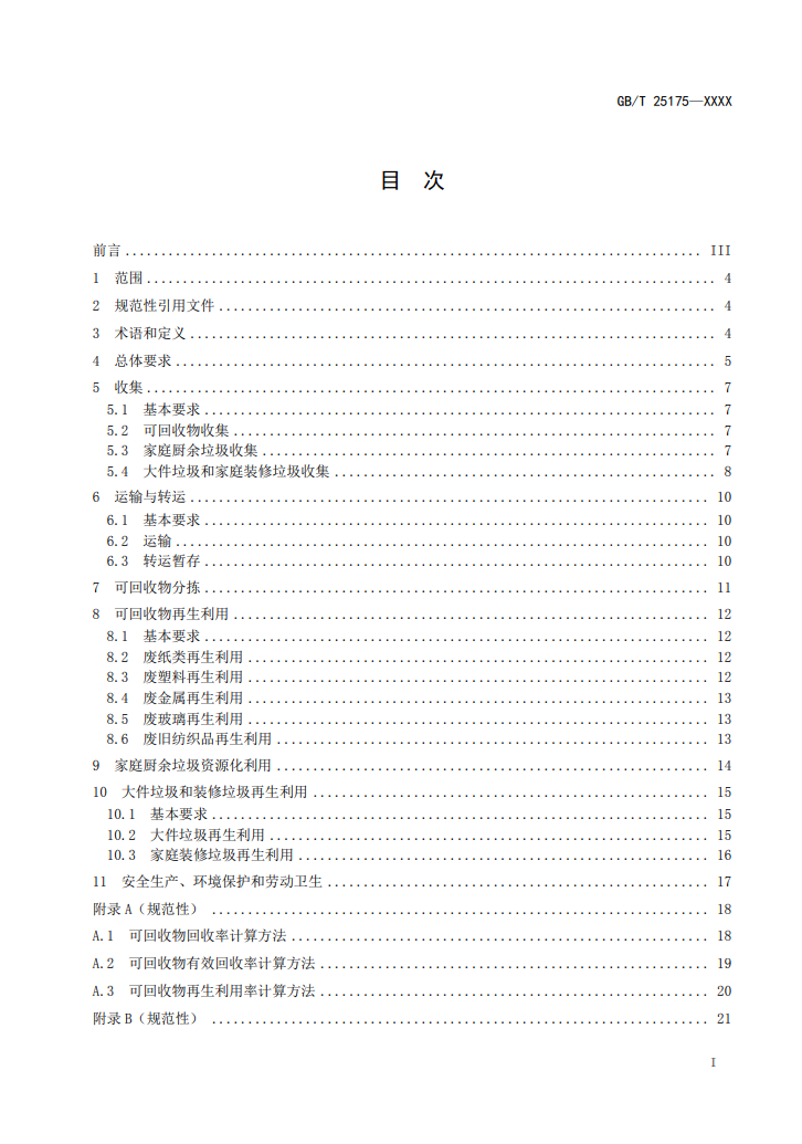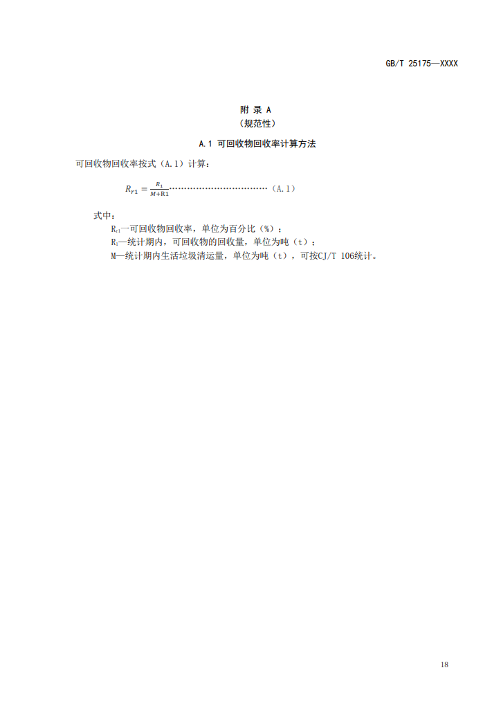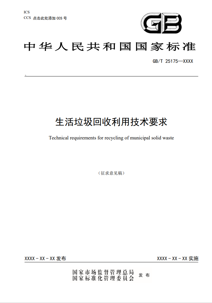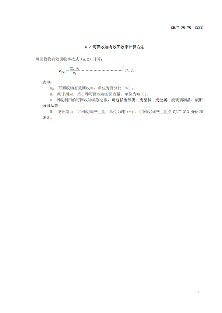 另外標準還對生活垃圾回收利用過程中的安全生產、環(huán)境保護和勞動衛(wèi)生做出了要求,并在附錄中提供了“可回收物回收率計算方法”、“可回收物有效回收率計算方法”、“可回收物再生利用率計算方法”、“家庭廚余垃圾分出率計算方法”、 “家庭廚余垃圾資源化利用率計算方法”。