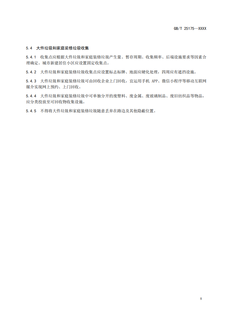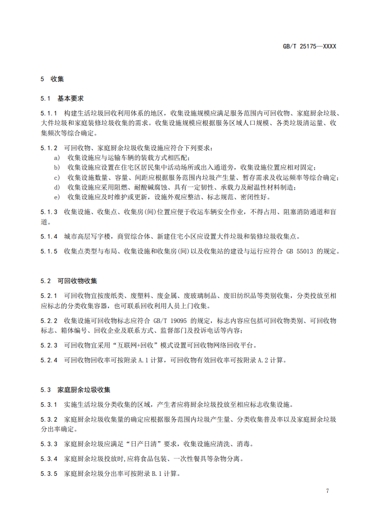 4、生活垃圾回收利用體系應包括(但不限于)收集、運輸與轉運、可回收物分揀與再生利用、家庭廚余垃圾資源化利用、大件垃圾和家庭裝修垃圾再生利用等環(huán)節(jié)。
