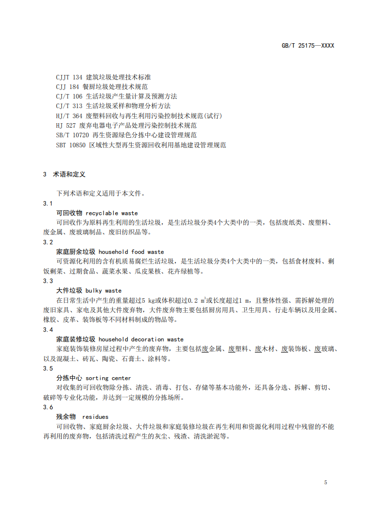 由于標準系由大件垃圾國標修訂而來,因此首先在術語部分進行了修改,對“可回收物”、“家庭廚余垃圾”、“大件垃圾”、“家庭裝修垃圾”、“分揀中心”和“殘余物”六項做出定義。