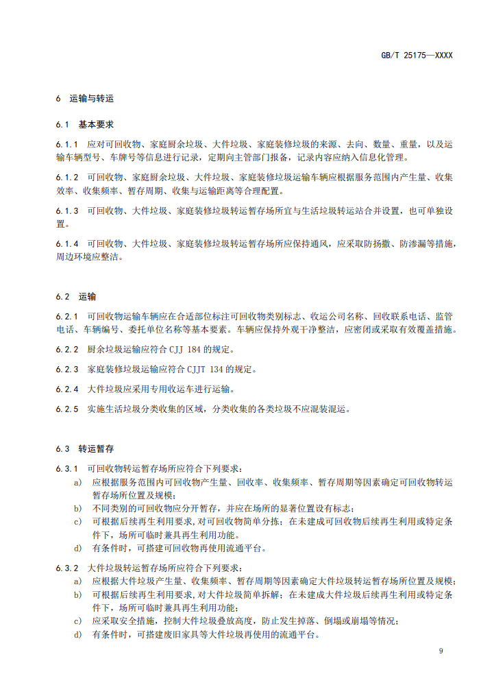 8、可回收物、家庭廚余垃圾、大件垃圾、家庭裝修垃圾的收集、轉運暫存、運輸方式應與后續(xù)的分揀、拆解、利用等方式相適應。