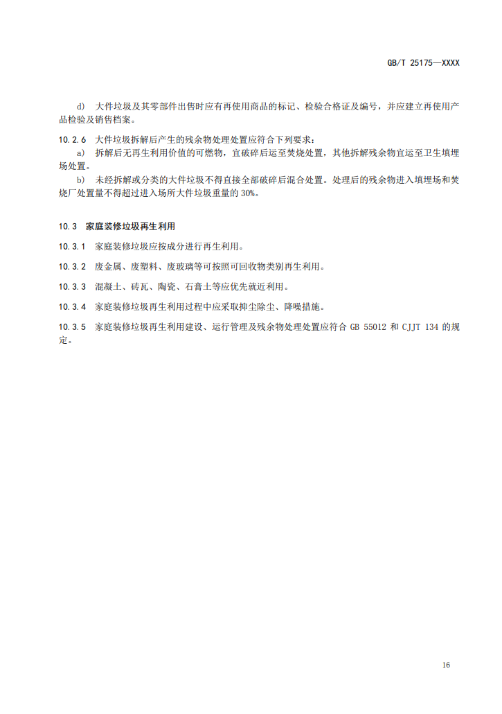 5、家庭裝修垃圾再生利用建設、運行管理及殘余物處理處置應符合GB55012和CJJT134的規(guī)定。