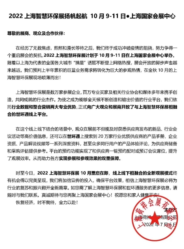 時(shí)至今日,2022上海智慧環(huán)保展10月重啟在即,線上線下相融合的全新觀展模式終有機(jī)會得以呈現(xiàn),我們將加倍宣傳的投入,確保平臺效果,相信上海智慧環(huán)保展必將為行業(yè)的復(fù)蘇和振興翻開全新篇章。如您需了解上海智慧環(huán)保展和世環(huán)通服務(wù)的更多信息,請隨時(shí)與我們聯(lián)系。真誠期待與您再聚上海國家會展中心!祝愿您和家人健康平安!