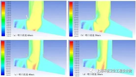 通過數(shù)值仿真技術(shù),針對高熱值垃圾焚燒爐火焰中心溫度過高等問題,開發(fā)垃圾焚燒爐高溫低氧燃燒技術(shù)(ZL201610326967.8),最大程度實(shí)現(xiàn)燃燒均質(zhì)化和溫度場均勻分布,有效緩解焚燒爐內(nèi)的結(jié)焦情況。同時(shí)將NOx 的初始生成濃度控制在180mg/Nm3以內(nèi),遠(yuǎn)低于普通焚燒爐300mg/Nm3。