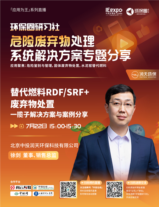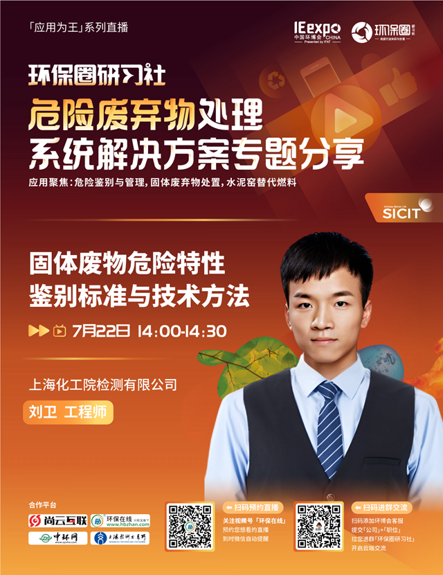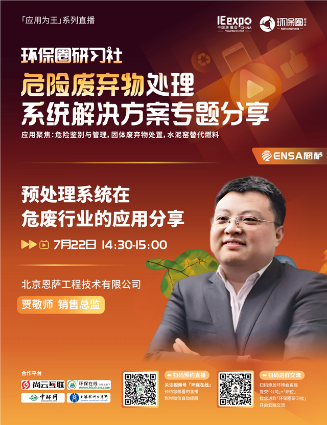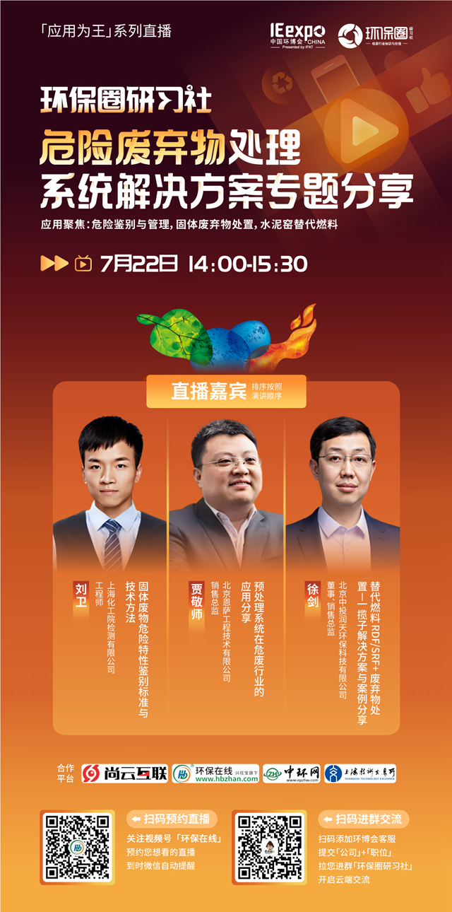 7月22日(星期五)下午14:00-15:30,環(huán)保圈研習(xí)社“應(yīng)用為王”系列直播,危險(xiǎn)廢棄物處理系統(tǒng)解決方案專題分享,我們有幸邀請到了上?;ぴ?、北京恩薩、潤天環(huán)保3家企業(yè)的技術(shù)專家做客直播間,與我們共同探討危險(xiǎn)廢棄物的鑒別與管理,危廢焚燒預(yù)處理,水泥窯協(xié)同處置等技術(shù)及相關(guān)解決方案。