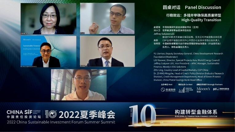 第二輪圓桌對(duì)話環(huán)節(jié)圍繞“多措并舉確保高質(zhì)量轉(zhuǎn)型”展開,由中國(guó)發(fā)展研究基金會(huì)副秘書長(zhǎng)俞建拖主持。世界能源理事會(huì)亞洲項(xiàng)目總監(jiān)劉小衛(wèi),穆迪ESG解決方案事業(yè)部副總裁、亞太區(qū)可持續(xù)金融業(yè)務(wù)經(jīng)理Jeffrey Sukjoon LEE,CDP全球環(huán)境信息研究中心中國(guó)辦公室資本市場(chǎng)業(yè)務(wù)負(fù)責(zé)人朱聆,中國(guó)郵政儲(chǔ)蓄銀行總行授信管理部授信政策處(行業(yè)研究處)負(fù)責(zé)人與綠色金融處負(fù)責(zé)人張明哲博士就高質(zhì)量轉(zhuǎn)型背景下,可持續(xù)金融存在的短板及其原因、以及潛在的解決方案展開了熱烈討論。Jeffrey指出,轉(zhuǎn)型金融對(duì)推動(dòng)亞太地區(qū)的可持續(xù)發(fā)展至關(guān)重要。如果所在行業(yè)減排難度大的發(fā)行人希望進(jìn)入可持續(xù)金融市場(chǎng)獲得可持續(xù)融資,他們就需要可信的轉(zhuǎn)型計(jì)劃、戰(zhàn)略和指標(biāo)。雖然我們看到企業(yè)在溫室氣體排放的信息披露方面取得了進(jìn)步,但在標(biāo)準(zhǔn)化和覆蓋范圍方面仍有很多工作要做。