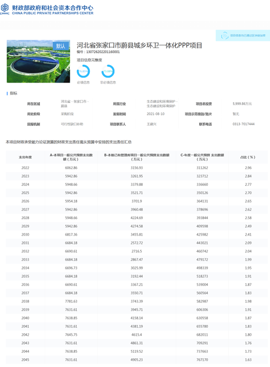 項目主要實施內(nèi)容包括蔚縣城鄉(xiāng)環(huán)衛(wèi)一體化服務(wù)(包括城區(qū)、鄉(xiāng)鎮(zhèn)環(huán)衛(wèi)服務(wù)兩部分),以及環(huán)衛(wèi)作業(yè)車輛和設(shè)施投入,合作范圍內(nèi)道路清掃保潔,灑水降塵,垃圾收集轉(zhuǎn)運,公廁維護,垃圾中轉(zhuǎn)站運營維護,特殊情況下的環(huán)衛(wèi)保障。項目合作范圍包括購置環(huán)衛(wèi)車輛、設(shè)施,新建數(shù)字化智慧環(huán)衛(wèi)系統(tǒng);道路綜合清掃保潔(含交通設(shè)施保潔)、道路綠化區(qū)域保潔、水域保潔(含護坡)、垃圾收運等服務(wù)。項目實施機構(gòu)負責(zé)項目推進過程中的協(xié)調(diào)審批工作,項目實施中的績效評價。項目公司負責(zé)項目的投融資、設(shè)備采購、更新改造和運營維護,由項目公司負責(zé)項目設(shè)施的日常運營服務(wù)和管理,包括設(shè)施的日常保養(yǎng)與提供環(huán)衛(wèi)保潔、垃圾收運服務(wù)。最高限價:將第一周期的可行性缺口補助金額5838.02萬元設(shè)定為最高投標限價。同時投標人需對可用性付費1087.15萬元和運維服務(wù)費5556.72萬元作為限價進行報價,中標價即可行性缺口補助按以下公式進行計算??尚行匀笨谘a助=可行性付費+運維服務(wù)費-805.84萬元。本項目合作期限設(shè)置為24年2個月。將運營前的車輛、設(shè)施購置設(shè)為項目建設(shè)期,建設(shè)期為2個月,運營期為24年。項目按8年一個周期循環(huán),第二周期和第三周期均需2個月進行車輛設(shè)備的購置,車輛設(shè)備購置不影響項目的正常運營,因此第二周期和第三周期的建設(shè)期同時為項目的運營期。