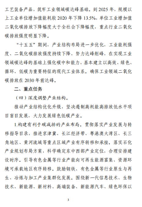 到2025年,規(guī)模以上工業(yè)單位增加值能耗較2020年下降13.5%,單位工業(yè)增加值二氧化碳排放下降幅度大于全社會下降幅度,重點行業(yè)二氧化碳排放強度明顯下降。