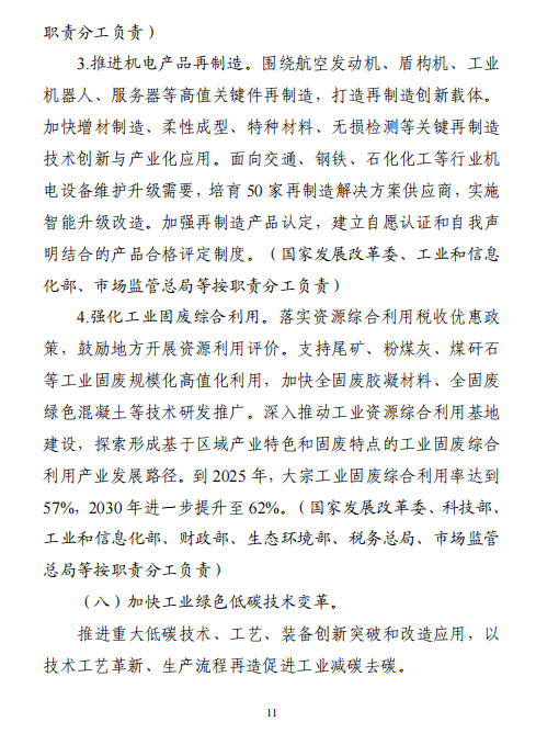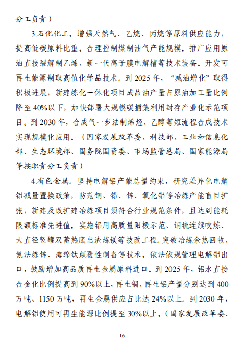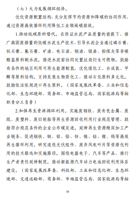 “十五五”期間,產(chǎn)業(yè)結構布局進一步優(yōu)化,工業(yè)能耗強度、二氧化碳排放強度持續(xù)下降,努力達峰削峰,在實現(xiàn)工業(yè)領域碳達峰的基礎上強化碳中和能力,基本建立以高效、綠色、循環(huán)、低碳為重要特征的現(xiàn)代工業(yè)體系。確保工業(yè)領域二氧化碳排放在2030年前達峰。方案指出,加強再生資源循環(huán)利用。實施廢鋼鐵、廢有色金屬、廢紙、廢塑料、廢舊輪胎等再生資源回收利用行業(yè)規(guī)范管理,鼓勵符合規(guī)范條件的企業(yè)公布碳足跡。延伸再生資源精深加工產(chǎn)業(yè)鏈條,促進鋼鐵、銅、鋁、鉛、鋅、鎳、鈷、鋰、鎢等高效再生循環(huán)利用。研究退役光伏組件、廢棄風電葉片等資源化利用的技術路線和實施路徑。圍繞電器電子、汽車等產(chǎn)品,推行生產(chǎn)者責任延伸制度。推動新能源汽車動力電池回收利用體系建設。