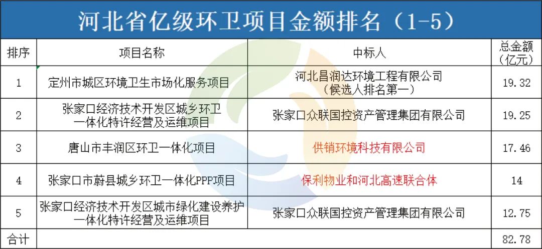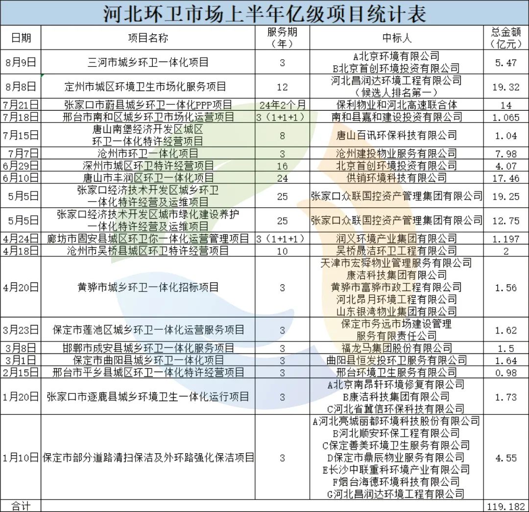 8月8日,超19億元的定州市城區(qū)環(huán)境衛(wèi)生市場(chǎng)化服務(wù)項(xiàng)目公布中標(biāo)候選人公示,河北昌潤(rùn)達(dá)環(huán)境工程有限公司排名第一;8月9日,約5.5億元三河市城鄉(xiāng)環(huán)衛(wèi)一體化項(xiàng)目又被北京環(huán)境有限公司和北京首創(chuàng)環(huán)境投資有限公司攜手?jǐn)孬@。至此,河北省今年已開標(biāo)的億級(jí)環(huán)衛(wèi)項(xiàng)目總金額已超119億元,加上在招標(biāo)項(xiàng)目,河北省今年環(huán)衛(wèi)項(xiàng)目的釋放量已超130億元!不僅如此,進(jìn)入2022年之后,河北省在生活垃圾末端處置方面的發(fā)展也較為迅速,主要體現(xiàn)在生活垃圾焚燒項(xiàng)目、建筑垃圾資源化利用項(xiàng)目等方面。而這一切的“大爆發(fā)”,和地方“十四五”時(shí)期各項(xiàng)規(guī)劃及相關(guān)政策有密切聯(lián)系。可以大膽地預(yù)測(cè),未來(lái)5年,河北將是環(huán)衛(wèi)企業(yè)競(jìng)相爭(zhēng)奪的“圣地”。項(xiàng)目釋放量突破130億,國(guó)資控股企業(yè)大放異彩