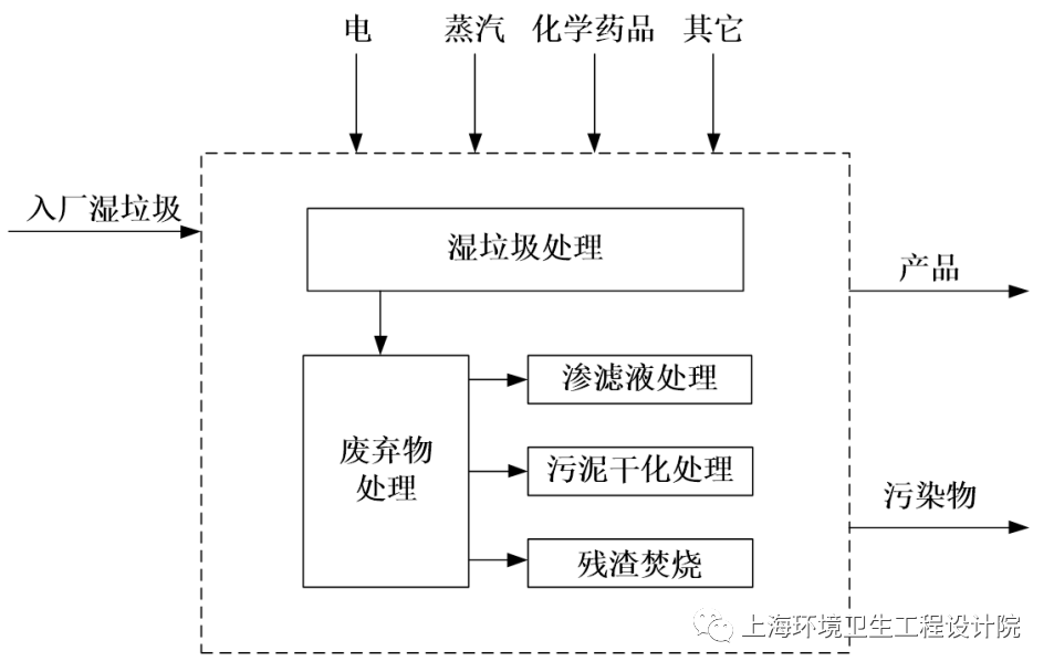 本文的研究邊界如圖2所示。針對濕垃圾處理整體工藝,本研究暫不關(guān)注中間具體工藝環(huán)節(jié)(破碎/制漿等),以整廠范圍為邊界,以入廠物質(zhì)為輸入,出廠物質(zhì)為輸出。出廠物質(zhì)以直接排放到大氣、水體(包括納管)的物質(zhì)(SOx、COD等)為準。當出廠物質(zhì)為雜物時,需匹配殘渣焚燒工藝;當出廠物質(zhì)為滲瀝液時,需匹配滲瀝液處理工藝;當出廠物質(zhì)為污泥時,需匹配污泥干化焚燒工藝。