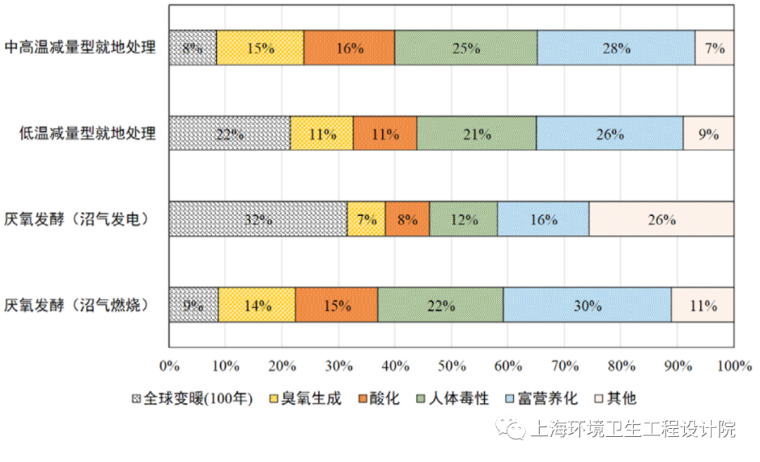 (二)中高溫減量型就地處理工藝的環(huán)境影響最為顯著,主要原因是電耗較高,上游電力生產(chǎn)過程采用燃煤發(fā)電工藝,其排放的磷和重金屬等導致了較為嚴重的富營養(yǎng)化和人體毒性。