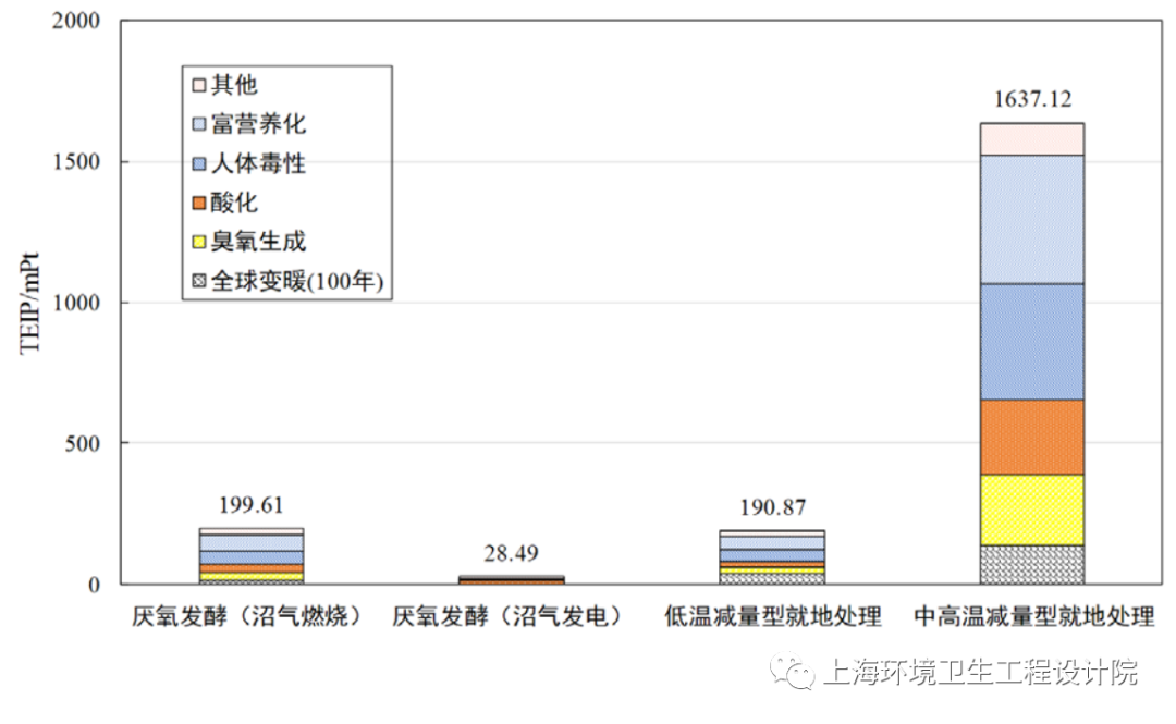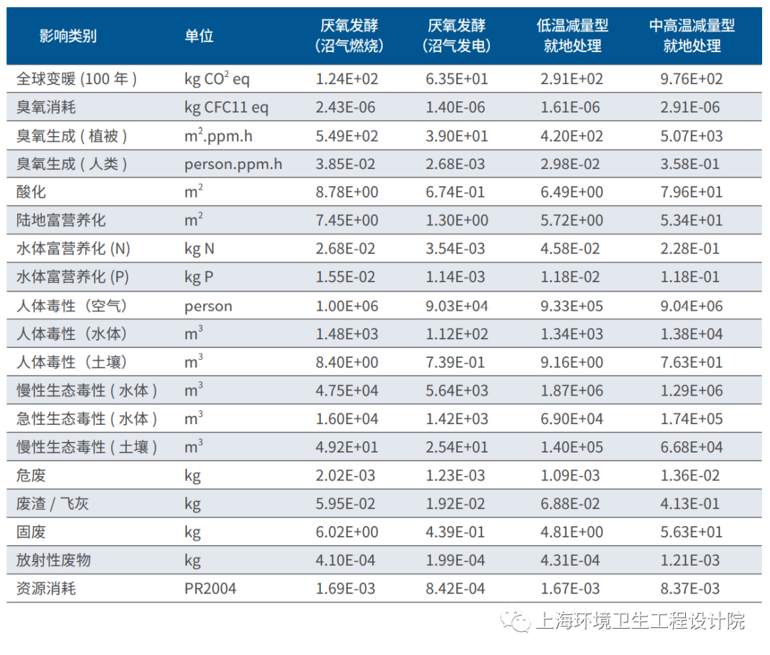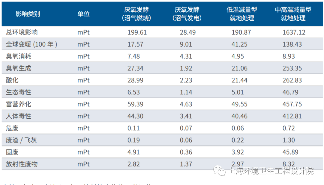 本文對厭氧發(fā)酵(沼氣燃燒)、厭氧發(fā)酵(沼氣發(fā)電)、低溫減量型就地處理、中高溫減量型就地處理四種典型工藝進行了生命周期環(huán)境影響對比研究。通過數(shù)據(jù)收集、清單分析和結(jié)果評價,得出以下結(jié)論:
