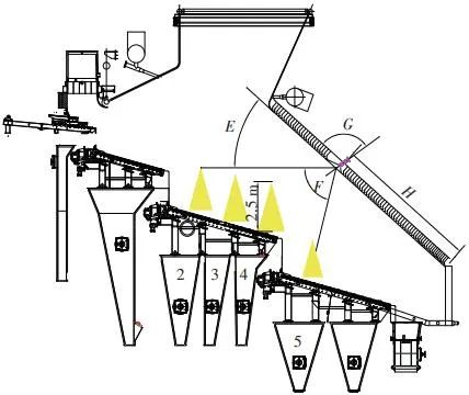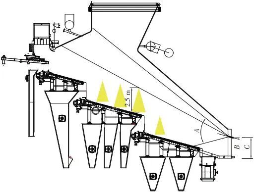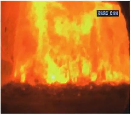 當(dāng)前生活垃圾焚燒爐廣泛采用的爐膛火焰監(jiān)視系統(tǒng)基本上都是由早期應(yīng)用在水泥廠、鋼鐵廠的加熱爐、退火爐和氧化鋁廠等行業(yè)內(nèi)的高溫看火工業(yè)電視演變升級而來。內(nèi)窺式數(shù)字高清爐膛火焰監(jiān)視系統(tǒng)成像裝置主要由耐高溫針孔電動鏡頭、寶石物鏡、光學(xué)濾光片、光圈焦距調(diào)節(jié)器等組成,配有電控推進(jìn)器、氣源控制柜、光端機(jī)等輔助設(shè)備。其核心問題是如何在生活垃圾焚燒爐的高溫、多塵、強(qiáng)腐蝕環(huán)境中長周期穩(wěn)定運(yùn)行,保證火焰畫面不丟包、不失真。1)優(yōu)勢特性分析。一是技術(shù)成熟、運(yùn)行穩(wěn)定。隨著我國近一二十年間生活垃圾發(fā)電廠的興建,爐膛火焰監(jiān)視系統(tǒng)的技術(shù)也處于不停地優(yōu)化和迭代之中,目前已能滿足穩(wěn)定、可靠的要求。其中常規(guī)配置參數(shù)為攝像頭300 萬像素,響應(yīng)時(shí)間2 s,光圈(F數(shù))1.6,焦距2.4 mm。二是工作環(huán)境好。爐膛火焰監(jiān)視器探頭通常安裝于焚燒爐后墻,所處位置是垃圾燃燒最末端,常規(guī)工況下探頭周圍煙氣溫度通常<600 ℃。較之焚燒爐其他高溫環(huán)境已算“宜居地帶”。三是維護(hù)量小。焚燒爐后墻幾乎沒有結(jié)焦現(xiàn)象,常規(guī)爐膛火焰監(jiān)視探頭開孔位置僅存有因爐膛偶爾正壓時(shí)煙氣外冒造成的積灰,積灰量不大,清理工作較為輕松。2)劣勢特性分析。一是參數(shù)單一。因垃圾焚燒行業(yè)爐型構(gòu)造和燃燒成分的特殊性,垃圾焚燒爐長期采用的火焰探頭利用的是光學(xué)成像原理,運(yùn)行人員僅能通過觀察火焰形狀和位置來判斷焚燒爐工況,無法得到多維度參數(shù)。二是視角局限。爐膛火焰探頭通常位于焚燒爐后墻,安裝角度朝向爐內(nèi)成斜向上方向,與水平線夾角15°左右,探頭視場角通常>60°。以某大型列動順推爐排焚燒爐為例,在此仰視角度下可以看到爐排燃燒段尾部、燃燼段前部兩面明顯的火焰幕墻,由于火焰鋒面遮擋,很難觀察到燃燒段中前部的火焰狀況。 以某單臺750 t/d大型列動順推爐排焚燒爐中爐膛火焰監(jiān)視器安裝位置和顯示畫面為實(shí)例,具體分析火焰成像狀態(tài)。其實(shí)際火焰成像畫面見圖1。成像角度是由焚燒爐后墻探頭位置向上仰視爐膛。因焚燒工況十分良好,靠近后墻的燃燼段區(qū)域幾乎沒有明火,燃燒段尾部成一面豎直、光亮的黃紅色火焰鋒面,高度約為2.5 m。對應(yīng)的爐膛火焰監(jiān)視器安裝示意如圖2所示。爐膛火焰探頭安裝在焚燒爐后墻,安裝位置與后墻觀火平臺地面距離為C(m)。開孔傾角與水平方向夾角為B(°),有效視場角為A(°)。圖2中由黃色填充的三角形區(qū)域代表正常燃燒火焰,其中標(biāo)注高度2.5 m的區(qū)域?yàn)槿紵隣t排尾部火焰,即為圖1所顯示的火焰鋒面。顯然,從爐膛火焰監(jiān)視器向上望去,燃燒段前部、中部火焰為視野盲區(qū)。由于被燃燒段尾部火焰鋒面遮擋,通過火焰監(jiān)視器通常只能看到燃燒段尾部、燃燼段前部這兩個區(qū)域的火焰。