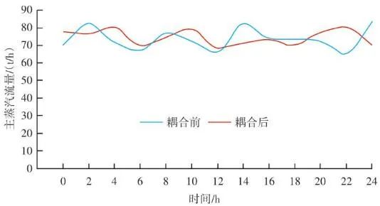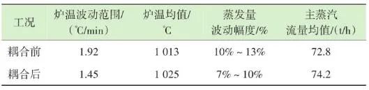 生活垃圾焚燒爐的排放物在滿足GB 18485—2014 生活垃圾焚燒污染控制標(biāo)準(zhǔn)的前提下,為保障焚燒爐的長期安全運(yùn)行、汽機(jī)系統(tǒng)的穩(wěn)定高效運(yùn)轉(zhuǎn),通常通過爐溫和主蒸汽流量這兩個因素來判斷鍋爐運(yùn)行是否良好。以下工況為某項(xiàng)目單臺750 t/d生活垃圾焚燒爐在紅外熱成像管理系統(tǒng)應(yīng)用前、應(yīng)用后兩段時(shí)期的實(shí)際運(yùn)行參數(shù),以此實(shí)例來解析該系統(tǒng)的運(yùn)行效果。該項(xiàng)目額定主蒸汽流量為74 t/h。如圖10所示,藍(lán)色實(shí)線為耦合前24 h變化率波動范圍,紅色實(shí)線為耦合后24 h變化率波動范圍。爐溫變化率指的是焚燒爐上、中、下3層共計(jì)9個溫度測點(diǎn)的熱電偶反饋溫度在每分鐘內(nèi)升高或降低的溫度值,而溫度變化率波動范圍指的是單位時(shí)間內(nèi)溫度變化率最高值與最低值之間的溫度差,該差值越大表明爐溫波動越大,即工況越不穩(wěn)定,波動范圍越小表明工況越平穩(wěn)。此期間溫度也一直未低于環(huán)保部要求的最低限(850 ℃/2 s),均介于950~1 050 ℃。焚燒爐主蒸汽流量曲線如圖11所示,左側(cè)縱坐標(biāo)為主蒸汽流量,額定蒸發(fā)量74 t/h。圖中藍(lán)色實(shí)線為紅外熱成像系統(tǒng)與ACC系統(tǒng)耦合前24 h的主蒸汽流量曲線,紅色虛線為紅外熱成像系統(tǒng)與ACC系統(tǒng)耦合后24 h的主蒸汽流量曲線。表1中參數(shù)可以計(jì)算出耦合前后焚燒爐爐溫波動范圍相對縮減了24.5%,焚燒爐爐溫均值提高了1.2%,蒸發(fā)量波動幅度縮減了3個百分點(diǎn),主蒸汽流量提高了1.4 t/h。經(jīng)過對主要運(yùn)行參數(shù)的定量分析,可以看出結(jié)合了紅外熱成像系統(tǒng)的ACC系統(tǒng)在功能性和穩(wěn)定性上有顯著提升。表1 重要運(yùn)行參數(shù)統(tǒng)計(jì)基于目前紅外熱成像管理系統(tǒng)的功能,正在逐步進(jìn)行焚燒爐溫度場重構(gòu)工作,對于紅外探頭收集的大量溫度點(diǎn)實(shí)時(shí)數(shù)據(jù)進(jìn)行整合并進(jìn)行紅外溫度顯示。傳感器擁有1 440×1 080個像素,其中每個像素都有對應(yīng)的溫度值,該溫度值隨著目標(biāo)溫度的變化在800~1 600 ℃對應(yīng)變化,那么我們就可以將800~1 600 ℃這個范圍內(nèi)的溫度數(shù)據(jù)映射到顏色空間中特定的彩色序列,只要在程序中明確規(guī)定溫度和顏色之間的映射函數(shù)和映射表即可實(shí)現(xiàn)相應(yīng)的偽彩顯示,即熱像圖的形式。這樣可為運(yùn)行人員提供更為直觀、立體的參考依據(jù),待溫度場重構(gòu)系統(tǒng)成熟后,再與ACC系統(tǒng)進(jìn)行結(jié)合,進(jìn)一步提高全廠的自動化程度。紅外熱成像管理系統(tǒng)在生活垃圾焚燒控制領(lǐng)域,與傳統(tǒng)ACC系統(tǒng)經(jīng)過合理的設(shè)計(jì)、安裝、邏輯耦合后,對焚燒自動化有以下幾個方面的改變和提升。1)視野擴(kuò)大。改變探頭安裝位置后,成像角度由仰視變?yōu)楦┮暎貙捔藸t內(nèi)火焰視場角度。火焰成像形狀由“一面火墻” 提升為“一片火?!?。在具備最基本的“遠(yuǎn)程看火”功能前提下,為運(yùn)行人員提供更強(qiáng)有力的參考依據(jù)。2)測溫準(zhǔn)確。紅外熱成像原理相比傳統(tǒng)光學(xué)成像原理,增加了溫度反饋功能。利用軟件管理系統(tǒng),將溫度信號解析,并與實(shí)際區(qū)域一一對應(yīng)。3)靈活性高。溫度測點(diǎn)的選定可通過管理軟件任意選擇,調(diào)試結(jié)束后仍可根據(jù)實(shí)際工況進(jìn)行設(shè)置和改變。4)耦合性強(qiáng)。紅外熱成像管理系統(tǒng)除現(xiàn)有功能外更像是一個平臺,可以對現(xiàn)有溫度參數(shù)和火焰狀態(tài)的大量數(shù)據(jù)進(jìn)行進(jìn)一步提升和利用,例如正在進(jìn)行的溫度場成像功能優(yōu)化和升級工作。5)效益提升。紅外熱成像管理系統(tǒng)融入ACC系統(tǒng)后,對焚燒爐溫度、鍋爐主蒸汽流量的穩(wěn)定性有顯著提升。對減少運(yùn)行人員工作量、增加產(chǎn)汽量、發(fā)電量等焚燒廠經(jīng)濟(jì)效益方面有不同程度提升。