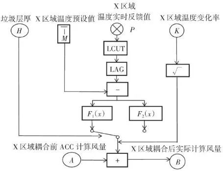 根據(jù)工藝設(shè)計(jì)和焚燒爐結(jié)構(gòu),從燃燒段至燃燼段前部為垃圾的燃燒區(qū)域,爐排底部依次有4行風(fēng)室,即圖7中所示2、3、4和5行風(fēng)室,每行各有3列,共計(jì)12個風(fēng)室。按照前述的項(xiàng)目實(shí)例,圖6中的12個紅外溫度測點(diǎn),可以得到依次對應(yīng)12個風(fēng)室上部的火焰圖像和燃燒溫度。在傳統(tǒng)ACC系統(tǒng)中,一次風(fēng)的理論供風(fēng)量主要依據(jù)垃圾熱值、垃圾占比、蒸發(fā)量設(shè)定值、鍋爐熱效率等參數(shù)計(jì)算得到,在得到理論計(jì)算值后,會根據(jù)鍋爐負(fù)荷、垃圾料層厚度、垃圾濕度、燃燒和燃燼段上部溫度等參數(shù)的波動對理論計(jì)算值進(jìn)行修正。其中溫度參數(shù)是由安裝在焚燒爐墻兩側(cè)的熱電偶反饋而來,爐溫?zé)犭娕嫉拈L度一般為1.0~1.3 m,除去爐墻壁厚,熱電偶露出爐內(nèi)的長度一般在250 mm左右,熱電偶材質(zhì)為鎳鉻-鎳硅,熱電偶前端耐磨頭長度為250~300 mm,耐磨頭材質(zhì)為鈷60。由于能夠反饋的溫度只能是熱電偶周圍溫度,因此會造成3點(diǎn)限制:①測點(diǎn)數(shù)量有限,若熱電偶數(shù)量增加,鍋爐開孔數(shù)量也要隨之上升,通常燃燒和燃燼區(qū)域安裝熱電偶數(shù)量為4~6支;②耦合性較高,抗干擾能力較低,其中的溫度修正系數(shù)雖然權(quán)重占比不大,但由于熱電偶數(shù)量有限,其單一溫度值對整體其他區(qū)域有連鎖影響,因此局部溫度與局部風(fēng)量無法一一獨(dú)立對應(yīng);③準(zhǔn)確性存在衰減,熱電偶的原理是溫度信號轉(zhuǎn)換成熱電動勢信號,通過二次儀表呈現(xiàn)被測介質(zhì)溫度。而隨著磨損、腐蝕的加重,其準(zhǔn)確性也逐漸衰減。其中鎳硅合金中的硅和鎳的優(yōu)先氧化是引起鎳鉻-鎳硅熱電偶熱電動勢超差、準(zhǔn)確性降低的主要原因。根據(jù)上述內(nèi)容,我們在得到理論計(jì)算風(fēng)量之后,針對每一段風(fēng)室進(jìn)行獨(dú)立的風(fēng)量修正。圖9中:M為對應(yīng)區(qū)域內(nèi)溫度設(shè)定值(℃);H為垃圾層厚度偏差百分比(%);P為對應(yīng)區(qū)域內(nèi)溫度實(shí)時(shí)反饋值(℃);K為對應(yīng)區(qū)域內(nèi)溫度變化率(℃/min);√ ̄為速度變化率高低限范圍(℃/min);LCUT為低切保護(hù)模塊(℃);LAG為高階濾波模塊(℃);A為理論計(jì)算風(fēng)量(m3/h);B為實(shí)際輸出計(jì)算風(fēng)量(m3/h)。