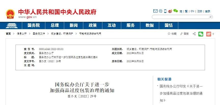 國(guó)務(wù)院辦公廳關(guān)于進(jìn)一步加強(qiáng)商品過(guò)度包裝治理的通知國(guó)辦發(fā)〔2022〕29號(hào)各省、自治區(qū)、直轄市人民政府,國(guó)務(wù)院各部委、各直屬機(jī)構(gòu):商品過(guò)度包裝是指超出了商品保護(hù)、展示、儲(chǔ)存、運(yùn)輸?shù)日9δ芤蟮陌b,主要表現(xiàn)為包裝層數(shù)過(guò)多、包裝空隙過(guò)大、包裝成本過(guò)高、選材用料不當(dāng)?shù)?。近年?lái),各地區(qū)、各部門(mén)按照《國(guó)務(wù)院辦公廳關(guān)于治理商品過(guò)度包裝工作的通知》(國(guó)辦發(fā)〔2009〕5號(hào))部署,認(rèn)真推進(jìn)商品過(guò)度包裝治理,完善相關(guān)法律法規(guī)標(biāo)準(zhǔn),取得積極進(jìn)展。但治理工作仍存在不少薄弱環(huán)節(jié)和突出問(wèn)題,尤其是隨著消費(fèi)新業(yè)態(tài)快速發(fā)展,商品過(guò)度包裝現(xiàn)象有“卷土重來(lái)”之勢(shì)。為貫徹落實(shí)黨中央、國(guó)務(wù)院決策部署,進(jìn)一步加強(qiáng)商品過(guò)度包裝治理,經(jīng)國(guó)務(wù)院同意,現(xiàn)就有關(guān)事項(xiàng)通知如下。各地區(qū)、各部門(mén)要以習(xí)近平新時(shí)代中國(guó)特色社會(huì)主義思想為指導(dǎo),深入貫徹習(xí)近平生態(tài)文明思想,立足新發(fā)展階段,完整、準(zhǔn)確、全面貫徹新發(fā)展理念,構(gòu)建新發(fā)展格局,推動(dòng)高質(zhì)量發(fā)展,認(rèn)真貫徹落實(shí)固體廢物污染環(huán)境防治法、消費(fèi)者權(quán)益保護(hù)法、標(biāo)準(zhǔn)化法、價(jià)格法等法律法規(guī)和國(guó)家有關(guān)標(biāo)準(zhǔn),充分認(rèn)識(shí)進(jìn)一步加強(qiáng)商品過(guò)度包裝治理的重要性和緊迫性,在生產(chǎn)、銷(xiāo)售、交付、回收等各環(huán)節(jié)明確工作要求,強(qiáng)化監(jiān)管執(zhí)法,健全標(biāo)準(zhǔn)體系,完善保障措施,堅(jiān)決遏制商品過(guò)度包裝現(xiàn)象,為促進(jìn)生產(chǎn)生活方式綠色轉(zhuǎn)型、加強(qiáng)生態(tài)文明建設(shè)提供有力支撐。到2025年,基本形成商品過(guò)度包裝全鏈條治理體系,相關(guān)法律法規(guī)更加健全,標(biāo)準(zhǔn)體系更加完善,行業(yè)管理水平明顯提升,線(xiàn)上線(xiàn)下一體化執(zhí)法監(jiān)督機(jī)制有效運(yùn)行,商品過(guò)度包裝治理能力顯著增強(qiáng)。月餅、粽子、茶葉等重點(diǎn)商品過(guò)度包裝違法行為得到有效遏制,人民群眾獲得感和滿(mǎn)意度顯著提升。二、強(qiáng)化商品過(guò)度包裝全鏈條治理(一)加強(qiáng)包裝領(lǐng)域技術(shù)創(chuàng)新。推動(dòng)包裝企業(yè)提供設(shè)計(jì)合理、用材節(jié)約、回收便利、經(jīng)濟(jì)適用的包裝整體解決方案,自主研發(fā)低克重、高強(qiáng)度、功能化包裝材料及其生產(chǎn)設(shè)備,創(chuàng)新研發(fā)商品和快遞一體化包裝產(chǎn)品。充分發(fā)揮包裝企業(yè)在推廣簡(jiǎn)約包裝、倡導(dǎo)理性消費(fèi)中的橋梁紐帶作用,推動(dòng)包裝設(shè)計(jì)、商品生產(chǎn)等上下游各環(huán)節(jié)踐行簡(jiǎn)約適度理念。(工業(yè)和信息化部和各地方人民政府按職責(zé)分工負(fù)責(zé))(二)防范商品生產(chǎn)環(huán)節(jié)過(guò)度包裝。督促指導(dǎo)商品生產(chǎn)者嚴(yán)格按照限制商品過(guò)度包裝強(qiáng)制性標(biāo)準(zhǔn)生產(chǎn)商品,細(xì)化限制商品過(guò)度包裝的管理要求,建立完整的商品包裝信息檔案,記錄商品包裝的設(shè)計(jì)、制造、使用等信息。引導(dǎo)商品生產(chǎn)者使用簡(jiǎn)約包裝,優(yōu)化商品包裝設(shè)計(jì),減少商品包裝層數(shù)、材料、成本,減少包裝體積、重量,減少油墨印刷,采用單一材料或便于分離的材料。(工業(yè)和信息化部、市場(chǎng)監(jiān)管總局等部門(mén)和各地方人民政府按職責(zé)分工負(fù)責(zé))督促商品生產(chǎn)者嚴(yán)格遵守標(biāo)準(zhǔn)化法要求,公開(kāi)其執(zhí)行的包裝有關(guān)強(qiáng)制性標(biāo)準(zhǔn)、推薦性標(biāo)準(zhǔn)、團(tuán)體標(biāo)準(zhǔn)或企業(yè)標(biāo)準(zhǔn)的編號(hào)和名稱(chēng)。(市場(chǎng)監(jiān)管總局和各地方人民政府按職責(zé)分工負(fù)責(zé))引導(dǎo)醫(yī)療機(jī)構(gòu)針對(duì)門(mén)診、住院、慢性病等不同場(chǎng)景和類(lèi)型提出藥品包裝規(guī)格需求。引導(dǎo)藥品生產(chǎn)者優(yōu)化藥品包裝規(guī)格。(國(guó)家衛(wèi)生健康委、國(guó)家藥監(jiān)局和各地方人民政府按職責(zé)分工負(fù)責(zé))(三)避免銷(xiāo)售過(guò)度包裝商品。督促指導(dǎo)商品銷(xiāo)售者細(xì)化采購(gòu)、銷(xiāo)售環(huán)節(jié)限制商品過(guò)度包裝有關(guān)要求,明確不銷(xiāo)售違反限制商品過(guò)度包裝強(qiáng)制性標(biāo)準(zhǔn)的商品。加強(qiáng)對(duì)電商企業(yè)的督促指導(dǎo),實(shí)現(xiàn)線(xiàn)上線(xiàn)下要求一致。鼓勵(lì)商品銷(xiāo)售者向供應(yīng)方提出有關(guān)商品綠色包裝和簡(jiǎn)約包裝要求。(商務(wù)部、市場(chǎng)監(jiān)管總局和各地方人民政府按職責(zé)分工負(fù)責(zé))督促指導(dǎo)外賣(mài)平臺(tái)企業(yè)完善平臺(tái)規(guī)則,對(duì)平臺(tái)內(nèi)經(jīng)營(yíng)者提出外賣(mài)包裝減量化要求。(商務(wù)部負(fù)責(zé))