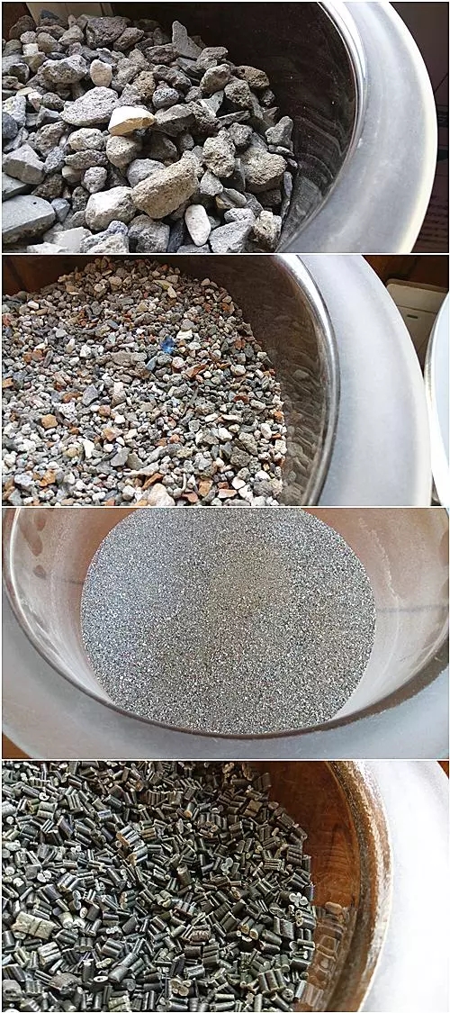 圖片說明:自上而下,依次是:大顆粒骨料、小顆粒骨料、粉末骨料和塑料顆粒