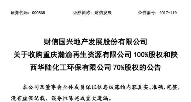 2017年9月29日,財(cái)信國興地產(chǎn)發(fā)展股份有限公司(以下簡(jiǎn)稱“財(cái)信發(fā)展”,股票代碼:000838)收購陜西華陸化工環(huán)保有限公司70%股權(quán)(詳見《財(cái)信國興地產(chǎn)發(fā)展股份有限公司關(guān)于收購重慶瀚渝再生資源有限公司100%股權(quán)和陜西華陸化工環(huán)保有限公司70%股權(quán)的公告》),華陸環(huán)保成為財(cái)信發(fā)展的控股子公司。
