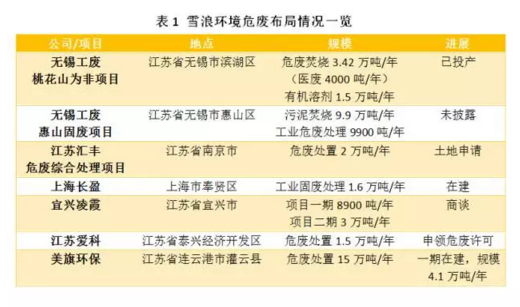 2016年11月,雪浪環(huán)境牽頭發(fā)起設(shè)立江蘇無錫雪浪金茂環(huán)保產(chǎn)業(yè)投資企業(yè)(有限合伙),基金總投資為5億元,雪浪環(huán)境通過設(shè)置企業(yè)并購(gòu)基金“無錫雪浪金茂”進(jìn)一步布局危廢市場(chǎng)。2017年7月,無錫雪浪金茂通過股權(quán)轉(zhuǎn)讓的形式收購(gòu)江蘇愛科65%的股權(quán)。2017年8月,無錫雪浪金茂通過股權(quán)轉(zhuǎn)讓的形式收購(gòu)美旗環(huán)保20%的股權(quán)。美旗環(huán)保擬投資建設(shè)灌云工業(yè)廢物綜合處理中心項(xiàng)目以處理灌云縣臨港產(chǎn)業(yè)區(qū)內(nèi)危廢為主,兼顧灌云、灌南、徐圩新區(qū)、響水等地危險(xiǎn)廢物綜合處理,總設(shè)計(jì)處理規(guī)模15萬噸/年,其中工程一期處理規(guī)模4.1萬噸/年。