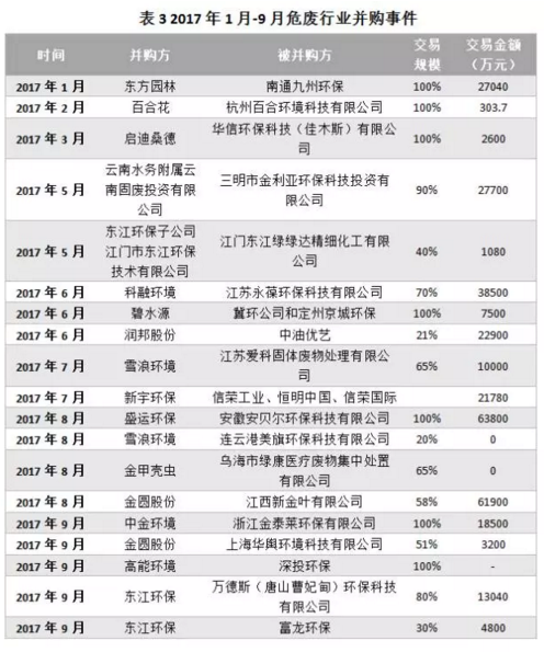 根據(jù)已有公開數(shù)據(jù)的不完全統(tǒng)計(jì),截至2017年9月,2017年危廢行業(yè)發(fā)起并購(gòu)行為19起起,累積交易金額32.46億元,并購(gòu)方既包括像東江環(huán)保、啟迪桑德、新宇環(huán)保這樣的“行業(yè)老兵”,也不乏碧水源、盛運(yùn)環(huán)保、中金環(huán)境等“后起之秀”,更有金圓股份等“跨界來者”。