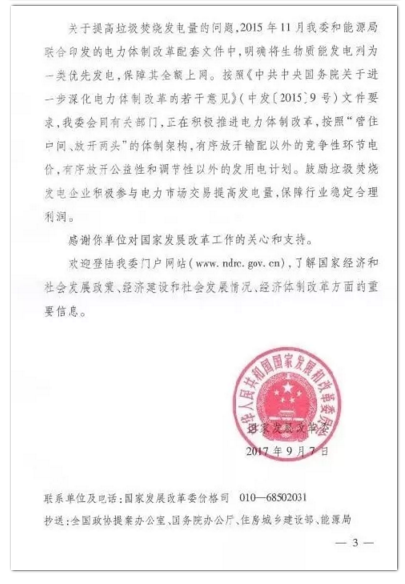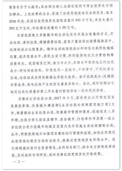 今年年初,環(huán)境商會以全國工商聯(lián)團體提案的形式向兩會遞交《關(guān)于適度提高垃圾焚燒折算電量的提案》,國家發(fā)改委于9月正式答復(fù)。