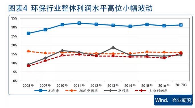 行業(yè)利潤(rùn)水平高位穩(wěn)定。2017年前三季度環(huán)保行業(yè)整體毛利率為31.27%,同比小幅下降0.41個(gè)百分點(diǎn);凈利率為14.51%,同比下降0.1個(gè)百分點(diǎn)。雖然非環(huán)保企業(yè)逐步開展環(huán)保類業(yè)務(wù)后,行業(yè)競(jìng)爭(zhēng)情況有所加劇,但由于行業(yè)空間足夠大、子行業(yè)較多以及特許經(jīng)營(yíng)制度,企業(yè)間競(jìng)爭(zhēng)呈現(xiàn)一定差異化特征,因此行業(yè)毛利率和凈利率均能保持高位穩(wěn)定狀態(tài)。