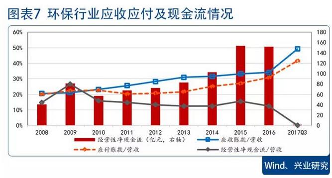 行業(yè)經(jīng)營(yíng)性現(xiàn)金流仍然較弱。環(huán)保行業(yè)2017年三季度經(jīng)營(yíng)性現(xiàn)金凈流量為1.45億元,同比下降95.46%,同時(shí),行業(yè)應(yīng)收賬款持續(xù)增長(zhǎng),2017年前三季度為499億元,占營(yíng)業(yè)收入比例升至49.2%的歷史高點(diǎn)。行業(yè)前三季度經(jīng)營(yíng)性現(xiàn)金流偏弱主要有四個(gè)原因:一、行業(yè)現(xiàn)金流呈現(xiàn)季節(jié)性特征,四季度回款一般會(huì)變好;二、設(shè)備制造類企業(yè)由于原材料大幅漲價(jià)導(dǎo)致購(gòu)買商品支付的現(xiàn)金大幅增加(科林環(huán)境、龍凈環(huán)保、菲達(dá)環(huán)保);三、部分污水處理企業(yè)承接的PPP項(xiàng)目增多,導(dǎo)致支付工程款、保證金及為業(yè)主墊款情況增加(碧水源、興源環(huán)境);四、個(gè)別企業(yè)票據(jù)業(yè)務(wù)結(jié)算情況增加,導(dǎo)致現(xiàn)金收入減少(盈峰環(huán)境)。