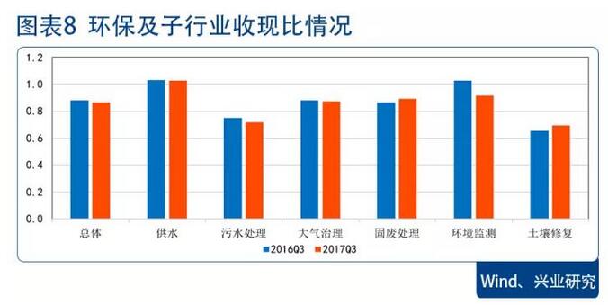 展望全年,環(huán)保行業(yè)2017年業(yè)績(jī)?cè)鏊賹⒊ツ辍母髯有袠I(yè)表現(xiàn)來(lái)看,前三季度污水治理子行業(yè)業(yè)績(jī)?cè)鏊偬嵘顬槊黠@,上市公司層面,流域治理訂單顯著增加。我國(guó)目前已認(rèn)定黑臭水體數(shù)量共有2,100個(gè),其中完成治理44.1%,待治理長(zhǎng)度約7,056公里,按照黑臭水體項(xiàng)目治理單位投資成本6,000萬(wàn)元左右計(jì)算,黑臭水體治理仍需投資4,233億元,2017年也是黑臭水體考核年,四季度相關(guān)公司業(yè)績(jī)將進(jìn)一步釋放。隨著年末項(xiàng)目集中結(jié)算,行業(yè)業(yè)績(jī)釋放的同時(shí)現(xiàn)金流也將得到改善。