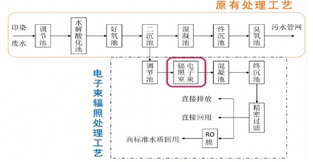今年3月,中廣核技在浙江省金華市浦江縣恒昌集團(tuán)建成了國(guó)內(nèi)首座電子束輻照處理印染廢水示范項(xiàng)目。該項(xiàng)目所在的印染企業(yè)每天產(chǎn)生印染廢水6000-9000立方米,原有環(huán)保設(shè)施采用傳統(tǒng)的生物處理工藝,末端經(jīng)臭氧脫色后間接排放至市政污水管網(wǎng)。示范工程建成后,廢水經(jīng)生物處理后再采用電子束輻照深度處理,設(shè)計(jì)規(guī)模為2000立方米/天。