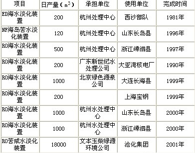 我國海水淡化技術(shù)的應用從上世紀七十年代初推廣用小型電滲析(ED)海水淡化器開始,1981年建成了200m3/d ED淡化裝置,“九五”期間相繼建成了RO淡水裝置,多為小型或示范工程(表1), 并向馬爾代夫和基里巴斯輸出了ED和RO海水淡化裝置。