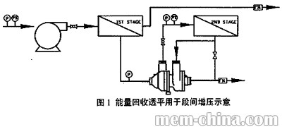反滲透裝置脫鹽部分與或級與級之間,可使用能量回收透平,以提高下一段或級的進水壓力,提高產(chǎn)水量。原理示意見圖1。Steven J.Duranceau等報道,1996年佛里達水服務公司在Marco島對現(xiàn)有15000m3/d苦堿水淡化進行改造,通過使用段之間的能量回收透平,使系統(tǒng)的產(chǎn)水量增加3780m3/d,增幅達25%。