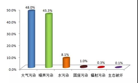 2017年8-10月全國各類舉報中,涉及大氣污染的舉報最多,占48%,其次為涉及噪聲、水、固廢的污染舉報,分別占45.3%、8.1%、1%,舉報量相對較少的為輻射污染和生態(tài)破壞,分別占0.3%和0.1%。