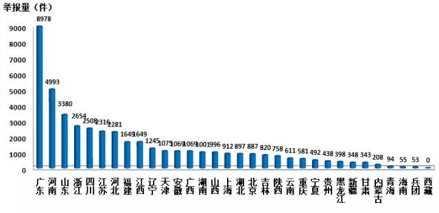 2017年8-10月,公眾使用微信舉報最頻繁的是廣東、河南兩省,舉報數(shù)量合計占全國總數(shù)的31.2%。
