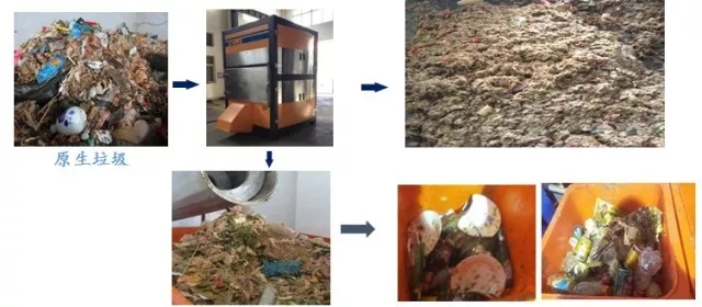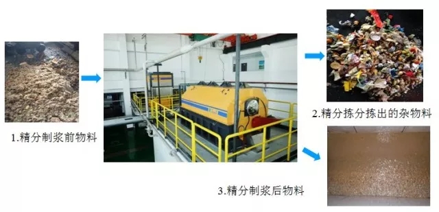 精分制漿機(jī)對(duì)物料進(jìn)行二次雜物分揀及破碎制漿,將物料中粒徑大小在20mm以上的雜物分離出系統(tǒng),如垃圾中的塑料、竹木、陶瓷、玻璃瓶、瓶蓋、筷子、骨頭以及貝殼等海鮮類(lèi)硬物質(zhì)雜物,雜物外運(yùn)處理。同時(shí)對(duì)大塊有機(jī)質(zhì)進(jìn)行破碎得到以有機(jī)質(zhì)8mm以下粒度的漿狀物料為主的均質(zhì)物料。