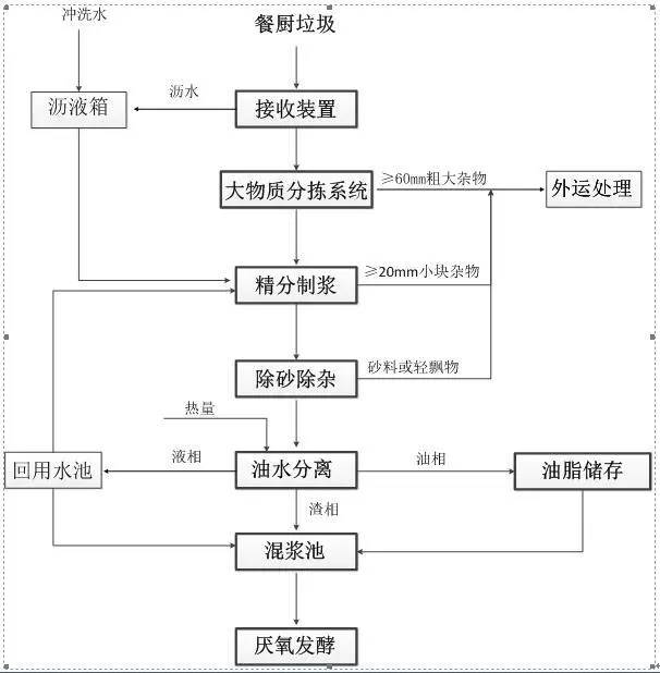 慈溪餐廚垃圾預(yù)處理工藝采用機(jī)械精細(xì)化分揀制漿工藝,即“物料接收+大物質(zhì)分揀+精分制漿+除砂除雜+油水分離”工藝,通過(guò)大物質(zhì)分揀+精分制漿+除砂除雜逐級(jí)減量化設(shè)計(jì),可有效去除物料中的雜物,保證了最大化地將一些對(duì)后道工序設(shè)備損壞最大的硬性物質(zhì)如:瓷盤(pán)、玻璃瓶、金屬物質(zhì)、貝殼、骨頭等和纖維類(lèi)輕性物質(zhì)如:塑料、餐巾以及砂粒和輕飄物如塑料、辣椒籽、木質(zhì)纖維等有效地分離出來(lái),得到的液相做油脂分離,避免這些物質(zhì)對(duì)輸送泵組、離心提油設(shè)備的磨損和堵塞。