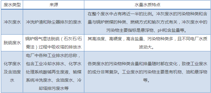 電廠廢水來(lái)源廣泛,主要分為以下幾類:沖灰廢水、脫硫廢水、工業(yè)廢水(化學(xué)廢水及含油廢水)。與化工、造紙等工業(yè)廢水相比,火電廠的廢水有以下特點(diǎn):水質(zhì)水量差異很大,劃分的廢水的種類較多;廢水中的污染成分以無(wú)機(jī)物為主,有機(jī)污染物主要是油;間斷性排水較多。電廠廢水來(lái)源及水質(zhì)特點(diǎn)總結(jié)于下表。
