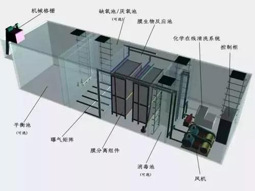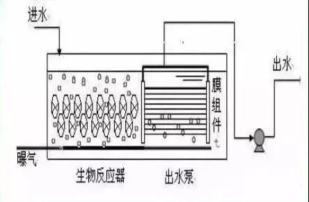 把膜組件置于生物反應(yīng)器內(nèi)部。進(jìn)水進(jìn)入膜--生物反應(yīng)器,其中的大部分污染物被混合液中的活性污泥去除,再在外壓作用下由膜過濾出水。
