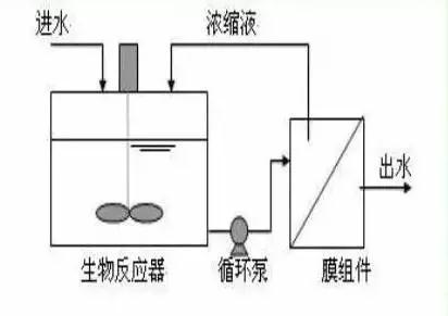 生物反應(yīng)器中的混合液經(jīng)循環(huán)泵增壓后打至膜組件的過濾端,在壓力作用下混合液中的液體透過膜,成為系統(tǒng)處理水;固形物、大分子物質(zhì)等則被膜截留,隨濃縮液回流到生物反應(yīng)器內(nèi)。