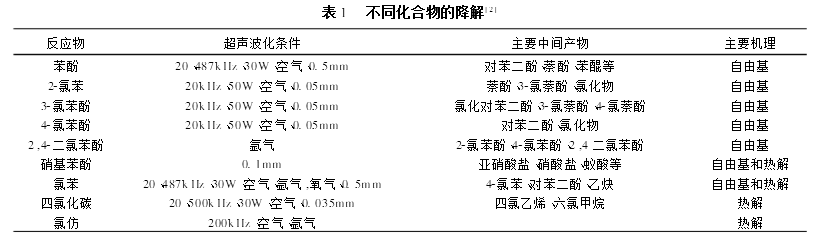 4.1超聲波反應(yīng)的條件控制比較困難。不同的底物由于其不同物理化學(xué)性質(zhì),其最佳的分解條件是不同的,尤其是考慮其經(jīng)濟(jì)性時(shí)。分解不同的底物時(shí),為使其達(dá)到最佳的分解效果,必須對(duì)超聲波的強(qiáng)度、分解時(shí)間、催化劑等條件進(jìn)行試驗(yàn)。
